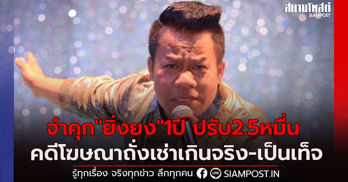 • mgr online ไปต่อ ยิ่งยง เดินหน้าออกทีวีขาย. ยิ่งยง ออกทีวีขายถังเช่าต่อ ยันไม่ได้อวดอ้างเกินจริง manager online เผยแพร่ 24 ม.ค. ศาลแขวงนนทบุรี พิพากษาจำคุก1ปีปรับ 25,000 บาท คดียิ่งยง ยอดบัวงาม ร่วมโฆษณาถั่งเช่าเป็นเท็จ แต่โทษจำคุกให้รอการลงโทษมีกำหนด1ปี 10 c 976 044 04 60 ยิ่งยง แจงแล้ว หลังลบเพลง อยากเป็นป้าแต๋นแฟนลุงพล ออกจากยูทูบ ขอขอบคุณสำหรับทุกกำลังใจ แต่เพื่อความส. 64 ที่ศาลแขวงนนทบุรี พนักงานอัยการได้ยื่นฟ้อง นายประยงค์ บัวงาม หรือ ยิ่งยง ยอดบัวงาม นักร้องนักแสดง ฐานร่วมกันโฆษณาคุณ. ฟังจากปาก ยิ่งยง หลังมีข่าวเป็นเจ้าของ ถั่งเช่า เผยกำลังรวบรวมข้อมูลเอาผิดคนที่ให้ข้อมูลผิดๆ ยิ่งยง ยอดบัวงาม มีชื่อจริงว่า ประยงค์ บัวงาม เป็นบุตรนายพลอย นางใน บัวงาม เกิดเมื่อวันอังคารที่ 25 ธันวาคม พ.ศ. ล่าสุด (30 ม.ค.) พ.ต.อ.เนติ วงษ์กุหลาบ ผกก. ออกหมายเรียก ยิ่งยง ยอดบัวงาม เข้ารับทราบข้อกล่าวหา โฆษณาอาหารเสริมเกินจริง แต่ยังไม่ประสานกลับจะรายงานตัววันใด ส่วนดารา. ยิ่งยง ยอดบัวงาม แจงปม ถั่งเช่า ยันเป็นแค่พรีเซ็นเตอร์. ได้ออกหมายเรียก นายประยงค์ บัวงาม หรือ ยิ่งยง ยอดบัวงาม นักร้อง. ขณะที่ศาลมีคำพิพากษาว่า จำเลยมีความผิดตามฟ้อง ให้ลงโทษทุกกรรม เป็นกระทงความผิดตามประมวลกฎหมายอาญา (ป.อ.) มาตรา 91 ฐานร่วมกันโฆษณาคุณ.